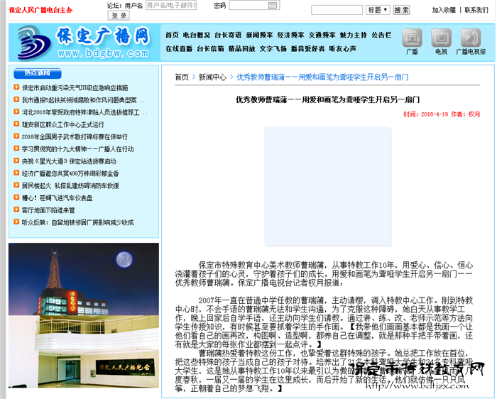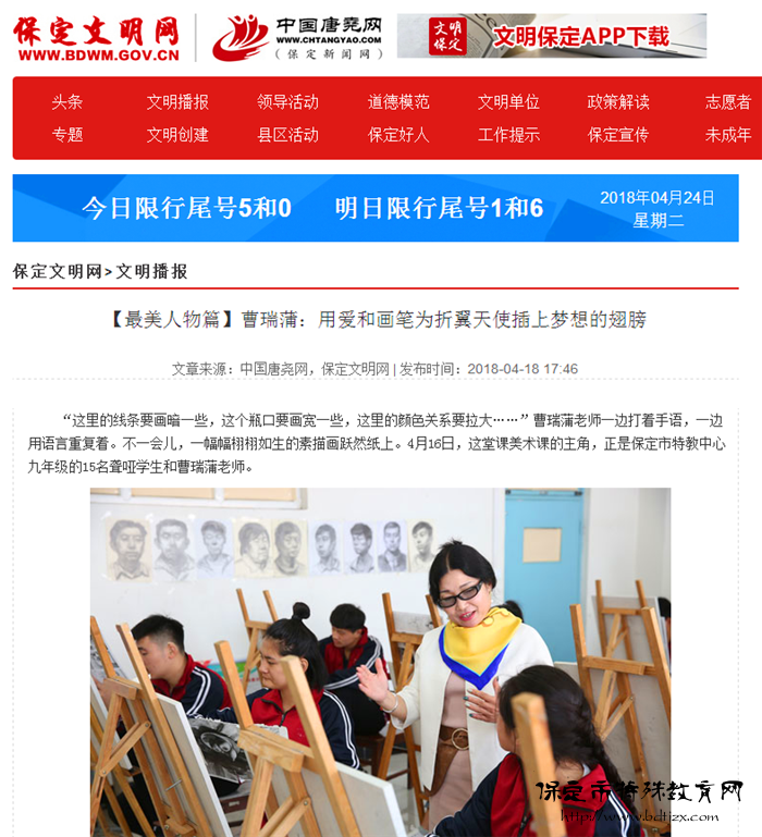 4月16日到23日,唐堯網(wǎng)、保定日?qǐng)?bào)社、保定電視臺(tái)等媒體先后來(lái)到保定市特教中心,對(duì)我校啟聰部曹瑞蒲老師進(jìn)行專訪。媒體記者詳細(xì)采訪了曹老師的教學(xué)經(jīng)歷,并聆聽曹老師為啟聰部九年級(jí)上美術(shù)公開課。采訪中,曹老師舉手投足間都透著陽(yáng)光和溫暖,讓采訪的記者印象深刻。