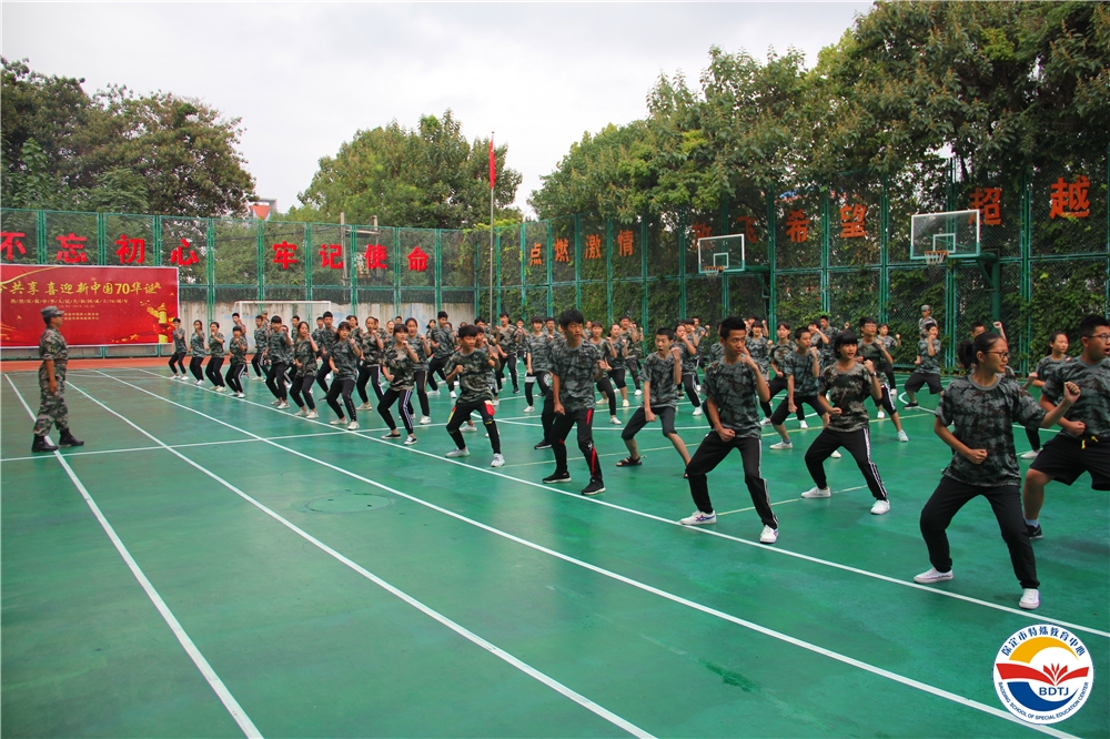 “格斗準備!”伴隨著教官的指令,“哈!”一聲整齊有力的吶喊聲,保定市特殊教育中心啟聰部、啟明部的同學們昂首挺胸,精神百倍地站在操場上,軍體拳表演開始了……