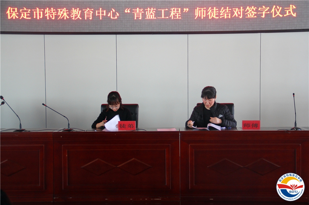隨后,結(jié)對(duì)教師在“保定市特殊教育中心青藍(lán)工程師徒協(xié)議”上鄭重下自己的姓名,并拍照留念。他們簽下的是誓言,許下的是一份沉甸甸的承諾。