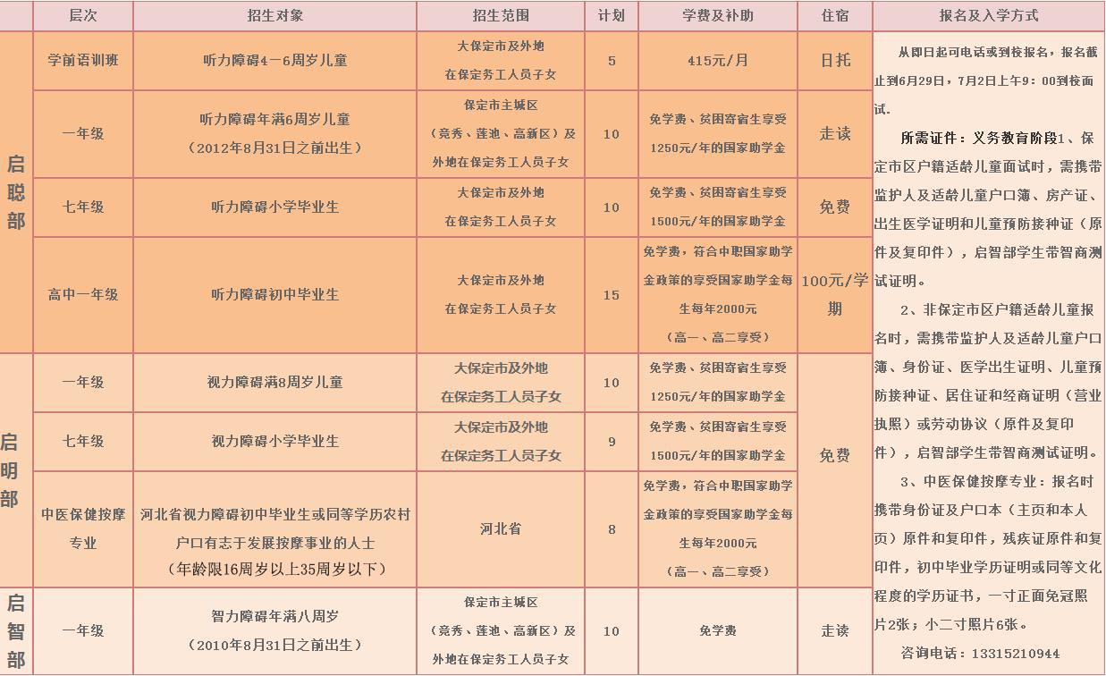 學(xué)校啟明部現(xiàn)有學(xué)生98人,6個(gè)教學(xué)班,專任教師19人。經(jīng)過多年的教學(xué)實(shí)踐,探索出“醫(yī)校結(jié)合”的辦學(xué)模式。學(xué)校從2009年開始招收視障學(xué)生,2014年經(jīng)河北省教育廳、河北省中醫(yī)藥管理局批準(zhǔn),與保定市第三中心醫(yī)院聯(lián)合開辦了盲人中醫(yī)按摩保健專業(yè),詣在培養(yǎng)盲生按摩技能,為將來就業(yè)奠定基礎(chǔ)。