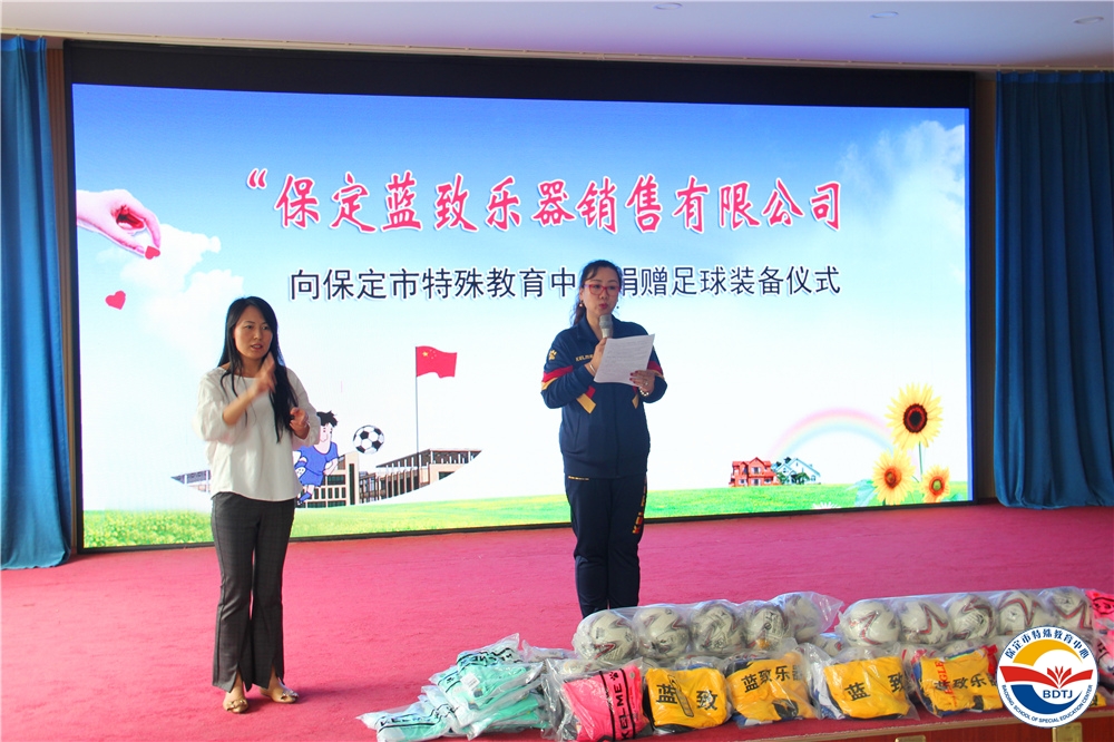 清風送爽、秋色宜人。9月19日下午,保定市特殊教育中心三樓多功能廳,愛心傳遞,暖流涌動。來自保定藍致樂器銷售有限公司領導和志愿者們,帶著為我校聾人足球隊捐贈的價值一萬元的足球訓練裝備,走進保定市特殊教育中心,用自己的實際行動詮釋了樂善好施的品德,充分彰顯了他們的愛心與魄力。